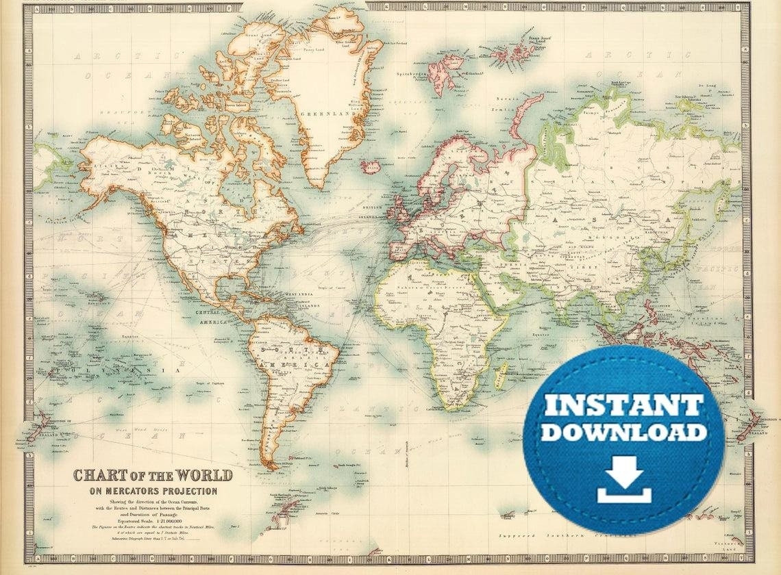 Digital Vintage World Map Printable Download Antique World Map