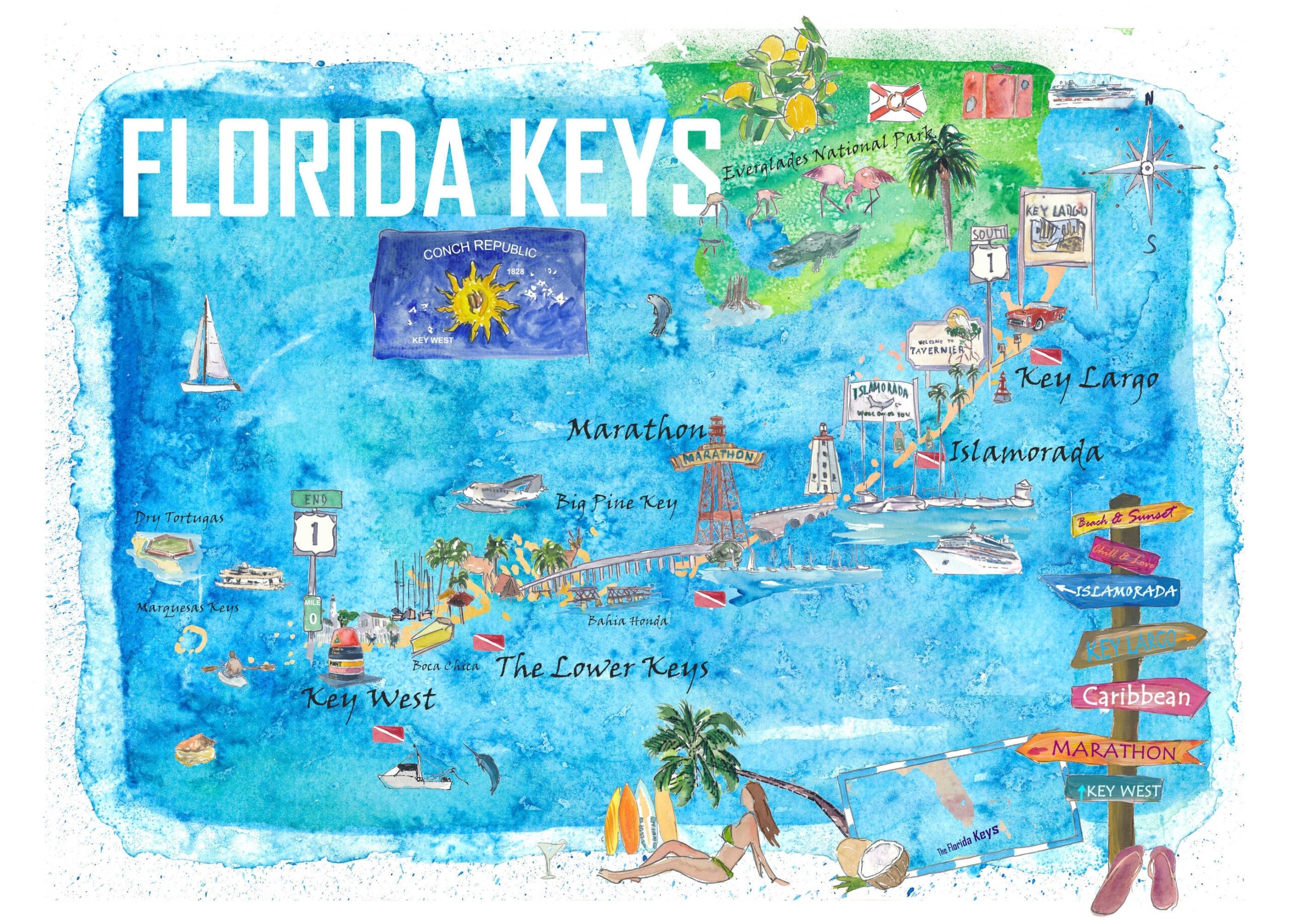 Florida Keys Key West Marathon Key Largo Illustrated Travel Poster Favorite Map 2nd Signpost Edition Etsy
